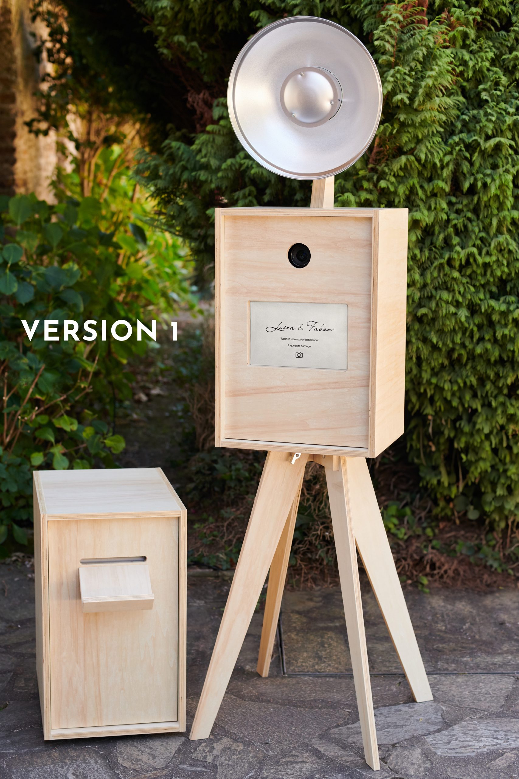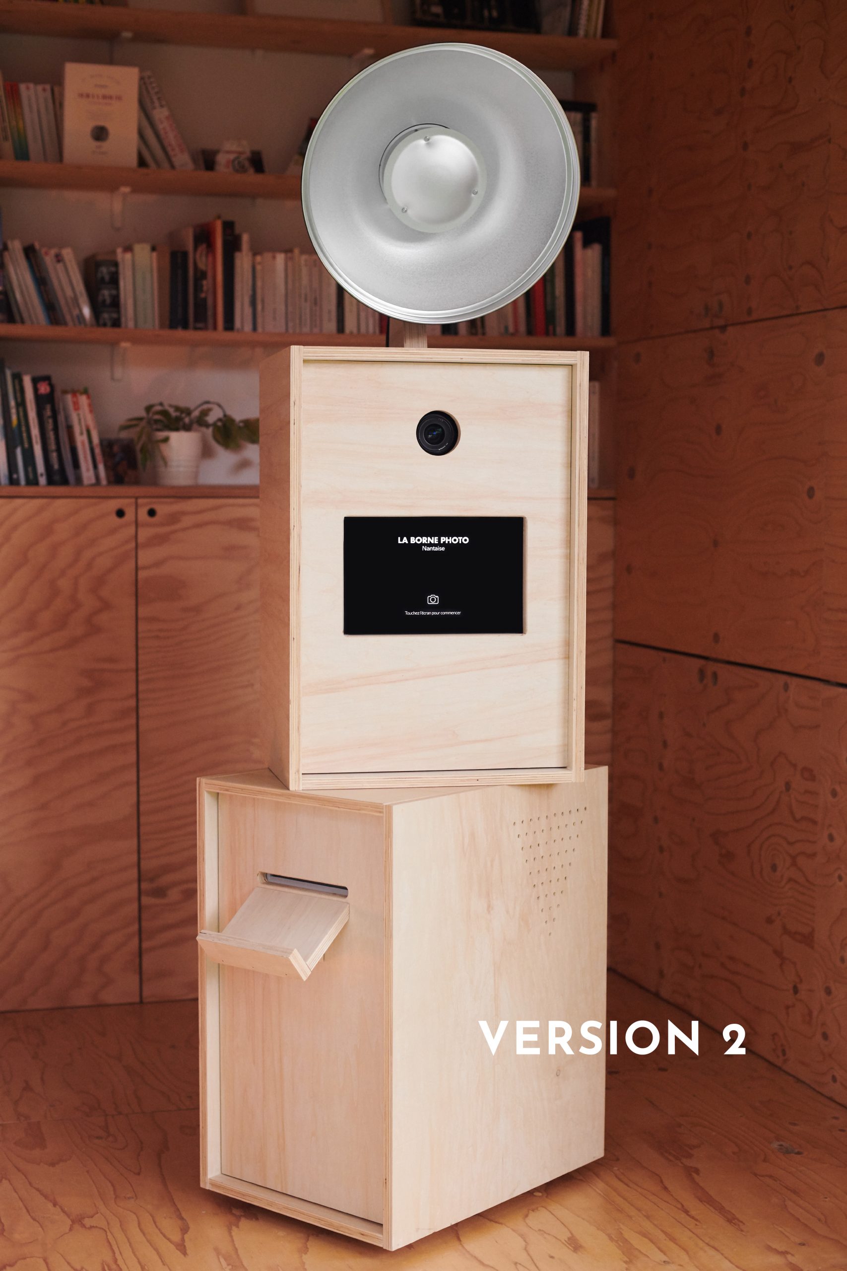 La borne photo nantaise, aussi appelée photobooth ou borne à selfies, a été entièrement conçue et fabriquée par mes soins, avec un panneau de bois issu d’une filière de réemploi de matériau. Chaque détail a été pensé pour une esthétique à la fois épurée et chaleureuse.